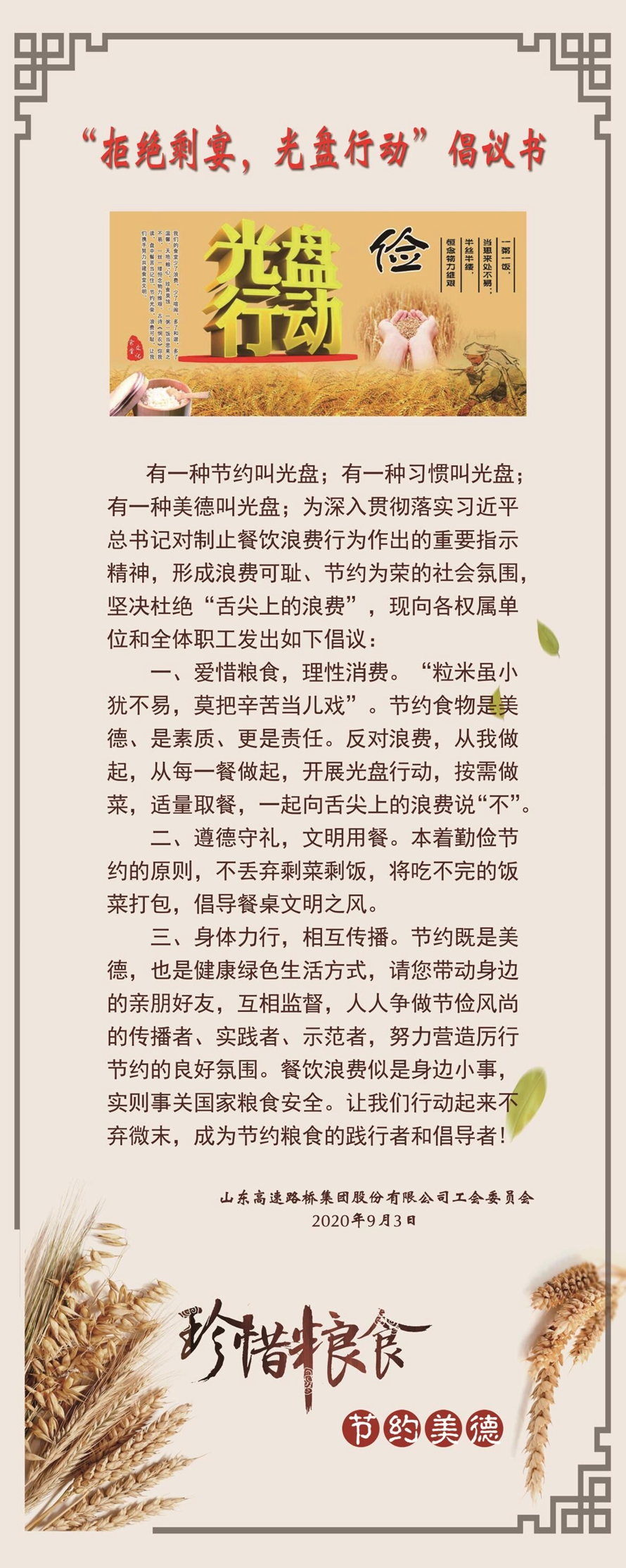 為貫徹落實(shí)習(xí)近平總書記制止餐飲浪費(fèi)的指示精神,路橋股份全體職工誓將“厲行勤儉節(jié)約,反對(duì)鋪張浪費(fèi)”的倡議深入開展。